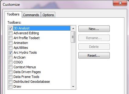 • Si volvemos a dar clic derecho en la barra de menú y bajamos con el puntero del ratón hasta el final, veremos la opción de «Customize…«, clic allí. En la pestaña Toolbars verificamos que las casillas de 3D Analyst ArcHydro y Georeferencing estén activadas.