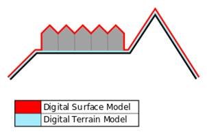 Fuente: Wikipedia. Como podemos ver el DSM afecta las cotas del terreno, mientras que el MDT no.