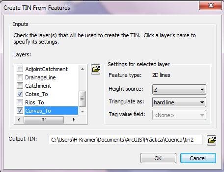 Para Curvas_To: En Height Source: Z y en Triangulate ass: soft line (se usa más para curvas de nivel que suavizan el contorno del TIN) y Hard line (si usamos shapes de carreteras, ríos, etc. Que producen un cambio brusco sobre la superficie del TIN), se recomienda usar Hard line.