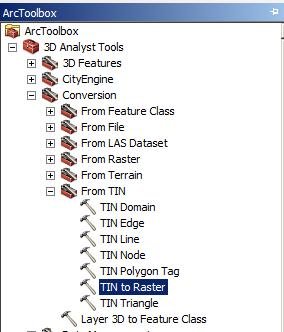 2) Este DEM es un raster que se crea de la siguiente manera: Abrimos el ArcToolBox, en 3D Analyst Tools – Conversion –From TIN – TIN to Raster.