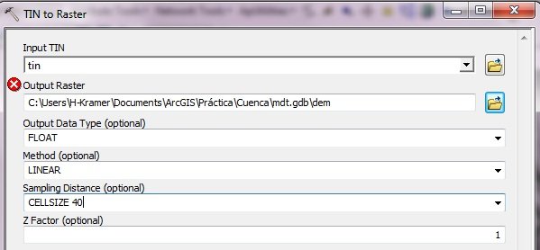 En el cuadro de dialogo seleccionamos el TIN creado (en Input TIN), luego le ponemos un nombre «dem», esto en Output Raster (aquí creamos una Geodatabase y guardamos el dem) y en “Sample distance” seleccionamos SELLCIZE 40, por lo general este valor se da a criterio, a menor valor la imagen será de mejor calidad y por ende más pesada. Luego quedaría de la siguiente manera.